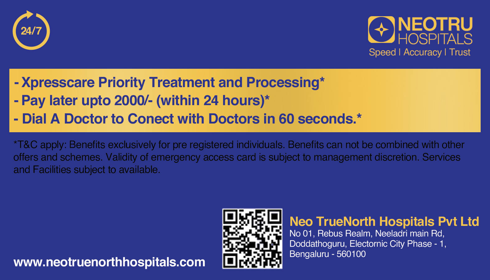 The Neo TrueNorth Emergency Access Card ensures you and your family get priority emergency treatment without worrying about immediate payment.